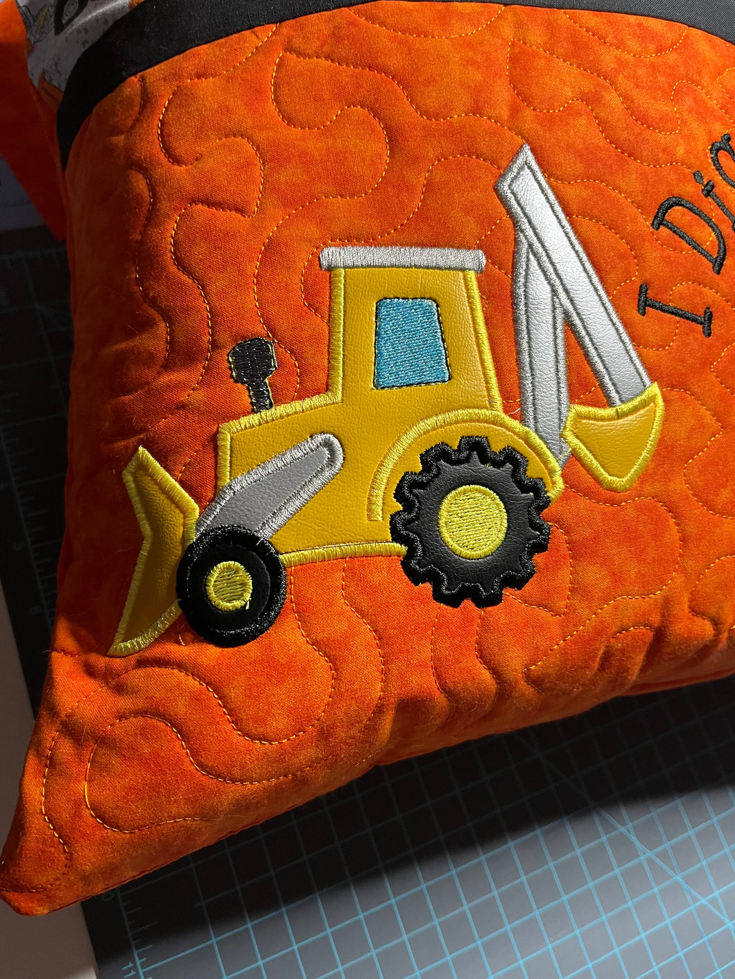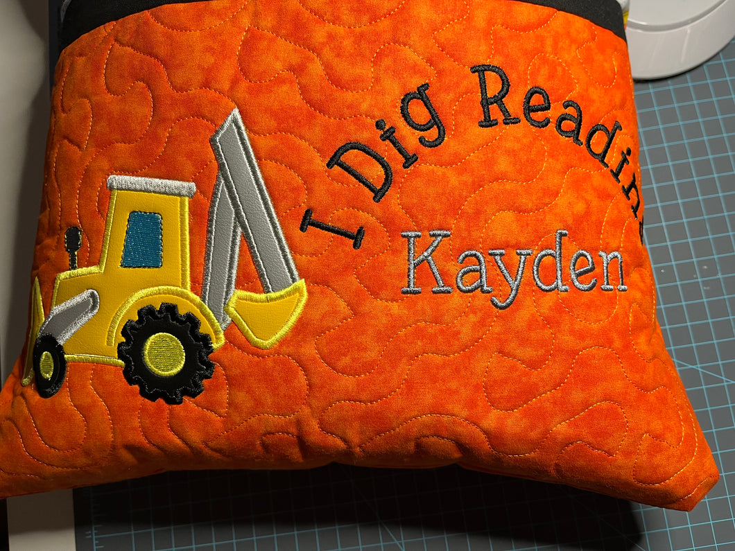 Truck book pillow. 16x16 appliqué loader with stitched personalization “Kayden” and “I Dig Reading”. Picture of actual item.